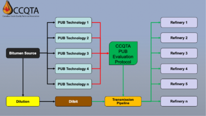 This project was initiated to evaluate PUB materials for risks to transportation and refinery processes. The composition of PUB materials is different from other oil sands products in their content of heavy components that have been altered by reactions at over 380°C. Diluted bitumen does not undergo such high-temperature treatment, and in synthetic crude oils these components have been removed. The project is focused on developing standardized test protocols to allow comparison of PUB materials produced via different technologies/conditions. Through multiple surveys of refiners, a list of potential refinery issues and their associated priority has been developed. The development of a standardized testing and evaluation protocol for PUB material will allow any refiners (North America and/or internationally) to evaluate the risk of varying PUB technologies to their operations considering using PUB in their crude slate. The availability of these tests, and the results of this study, will increase the number of refineries willing to buy Alberta PUB and reduce potential price discounts by eliminating unknown risks to refinery operation.